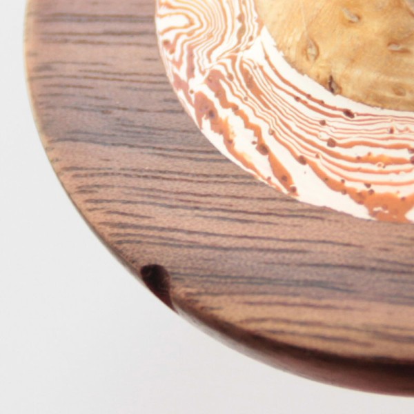 American Black Walnut with a white/terracotta resin inlay and a Burr Ash centre. The Burr Ash is a tiny piece I'd saved for a while, from Castle Bolton in North Yorkshire.